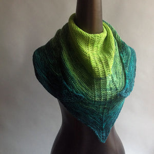 A sweet and easy shawlette in a rich gradient of tropical greens.
